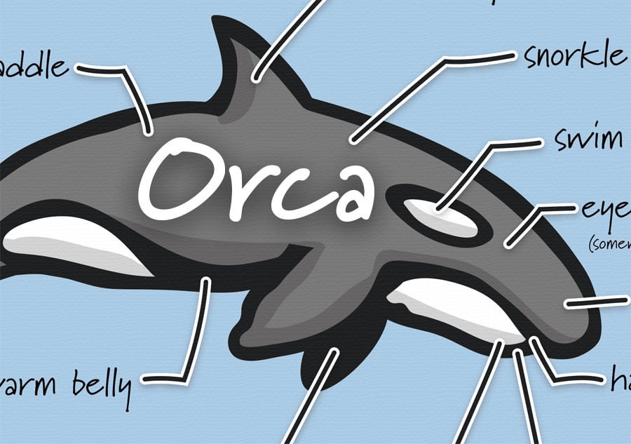 Illustrated diagram of a killer whale. Accurate depiction of physiology and biologist-approved terminology.